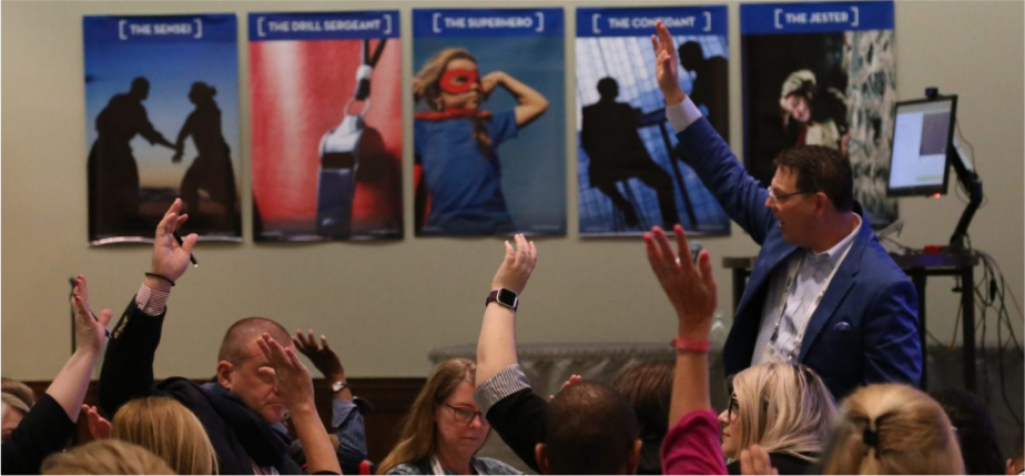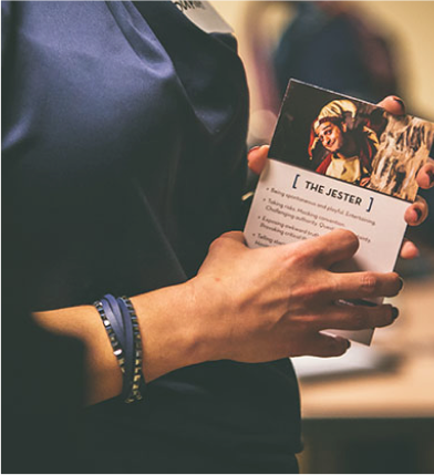The Jester is a facilitator who is playful and spontaneous. They understand when levity is required. It might be needed to help the group open up or reset after a difficult topic, to build rapport and connection as the session gets started, or even to help participants put less pressure on themselves as they embark on building new skills. Stepping into the Jester role is often overlooked as a core facilitation skill, but it is critical for successful participant engagement and impact.